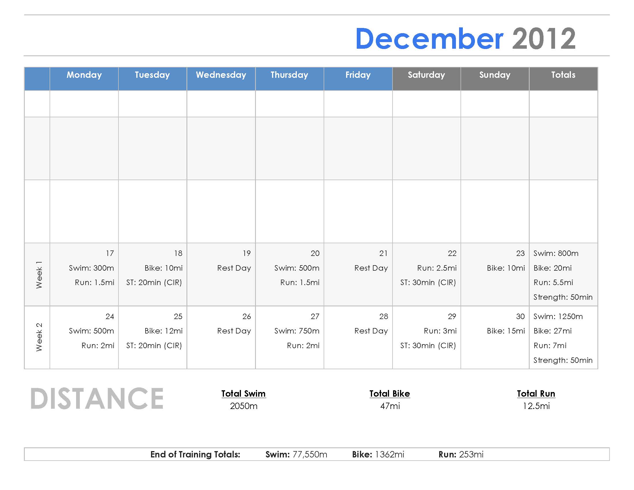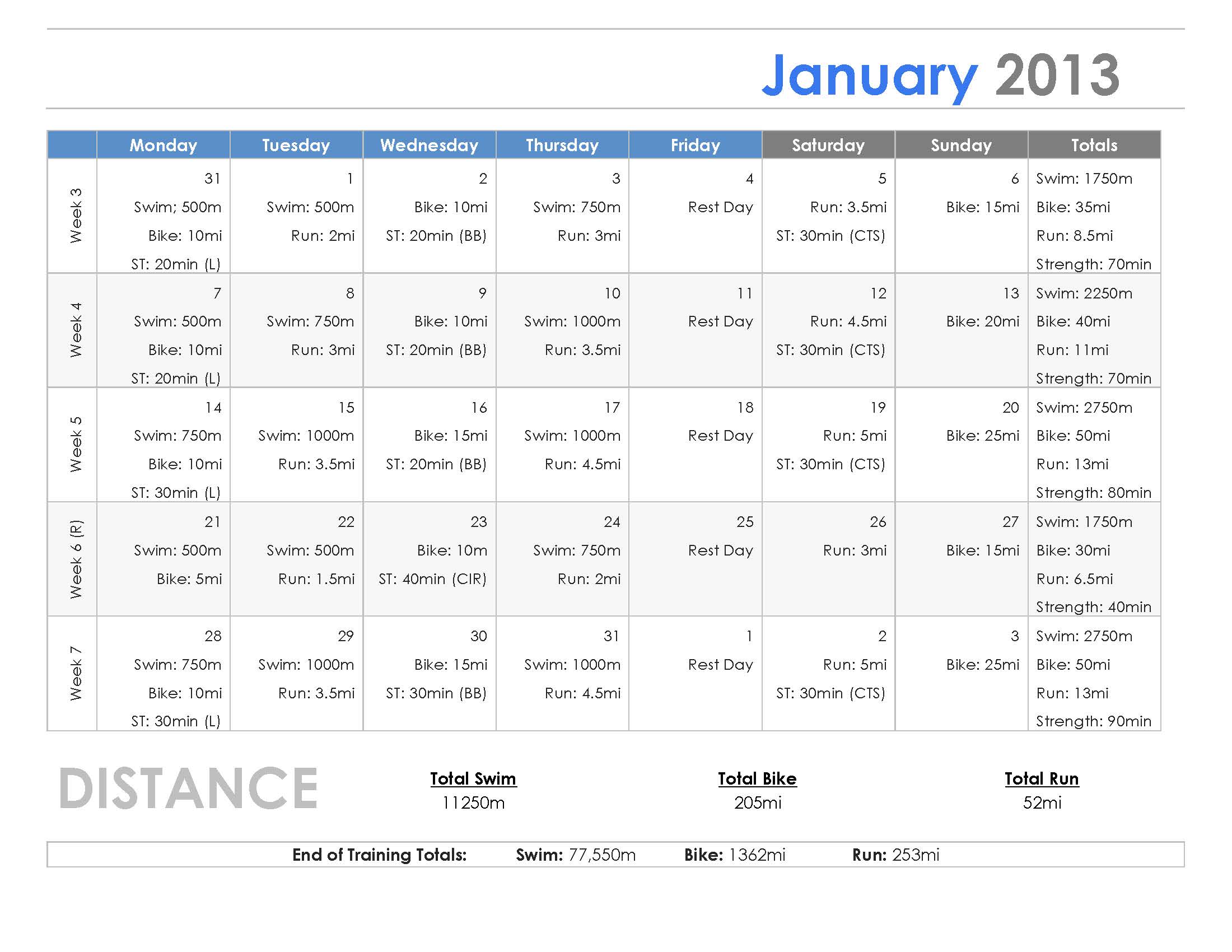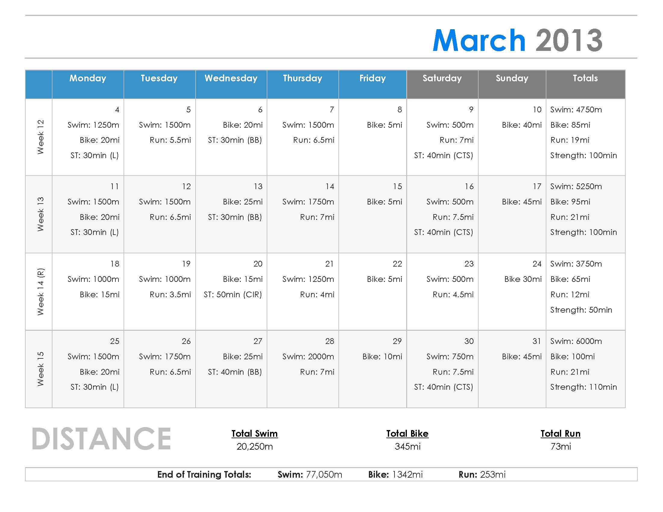 At the end of training the projected total distances for the three sports were as follows: 77,550 meters of swimming, 1342 miles of cycling, and 256 miles of running. I only skipped three exercises total so I was pretty close to these goals. I am really proud of this even though I didn’t complete the race. I will now move on to training for my makeup race, the Triathlon at Pacific Grove on September 14th, but my training will be different. Since I am at a new level of fitness, I can focus on speed and power instead of only strength and endurance. I also plan to begin at the distances in week 11 of this plan ans 80% of my weight max in each exercise. This will allow me to perform even better in September.