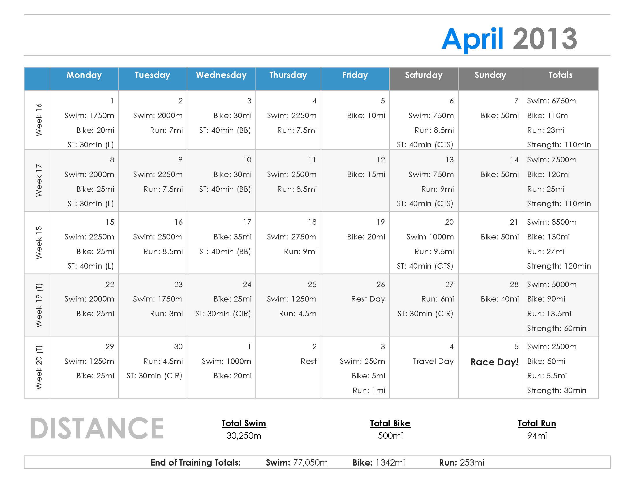 While I was unable to actually run the Wildflower 2013 Olympic Distance Triathlon this year (You can see why in this post: Triathlons and Babies) I did train for 20 weeks and I was sure that I was ready for the race because of my training plan. Since I was very much out of shape the plan started as basic levels and did a 3 week on 1 week off peak plan for 18 weeks. It was focused solely on strength and endurance at the expense of speed but since this was to be my first triathlon finishing was most important. Over the 18 weeks of real training with a 2 week taper, my strength and endurance skyrocketed and I lost 20 pounds (192 to 172). As a comparison, my 1st week totals were 800 meters of swimming, 20 miles of cycling, 5.5 miles of running, and 50 minutes of weight training while my 18th week totals were 8500 meters of swimming, 130 miles of cycling, 27 miles of running, and 120 minutes of weight training. In the three sports this is a huge increase, 1000% in swimming, 750% in cycling, and 500% in running.