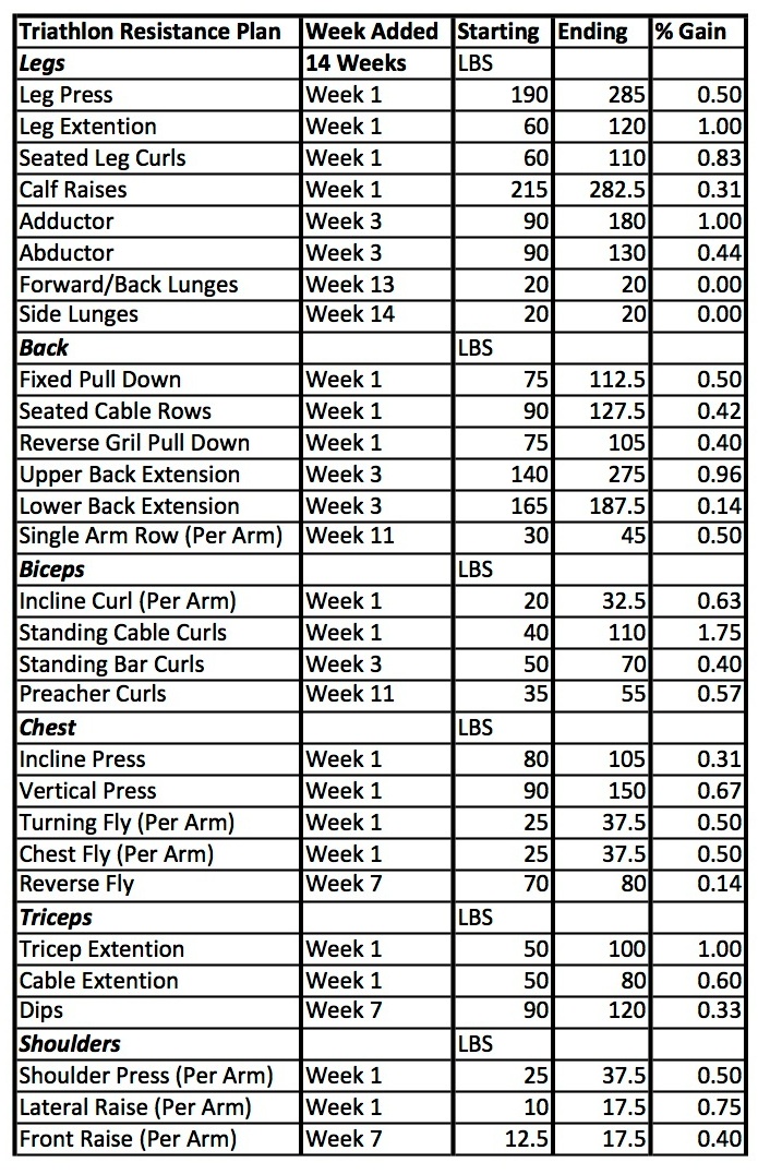 In strength, time wasn’t the real measure, it only allowed me to increase the number of exercises. This chart shows the actual change over the 14 weeks I used the weight room; you can see the weight I started, ended, percent increase, and week the exercise began. All exercises were performed in an attempt at 3 sets of 12. Once I hit that point I increased weight the following week.